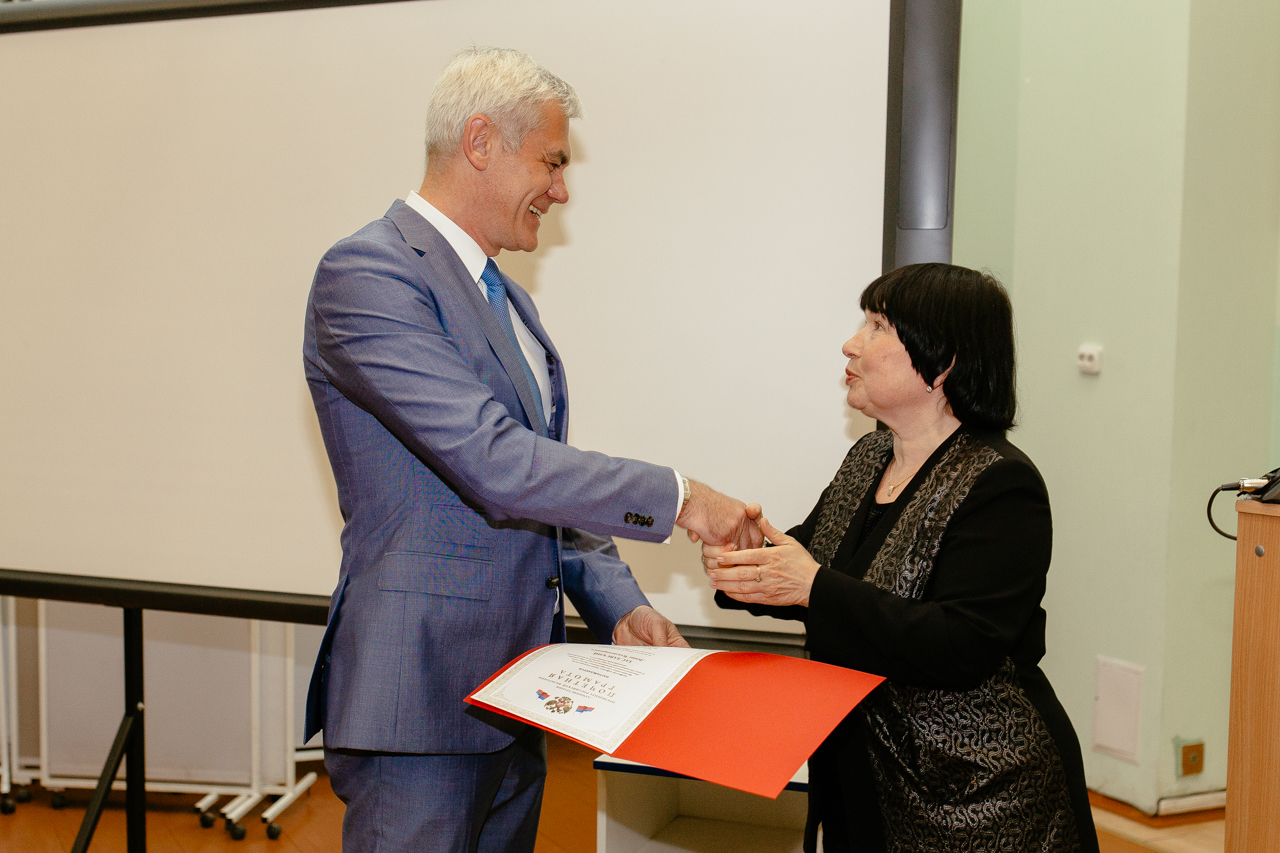 От имени полномочного представителя Президента РФ в СЗФО педиатров поздравила федеральный инспектор по Санкт-Петербургу Татьяна Юрьевна Кубракова: «Не найдется ни одной семьи, в которой не было бы родных или знакомых, не связавших свою жизнь с медициной. Мы постоянно обращаемся к вам за помощью, и мы чувствуем ваше тепло и поддержку в трудные для нас минуты». Кроме того, от имени полномочного представителя Президента РФ в СЗФО Николая Николаевича Цуканова почетную грамоту за добросовестный и многолетний труд получил заведующий кафедрой дерматовенерологии СПбГПМУ Денис Владимирович Заславский.