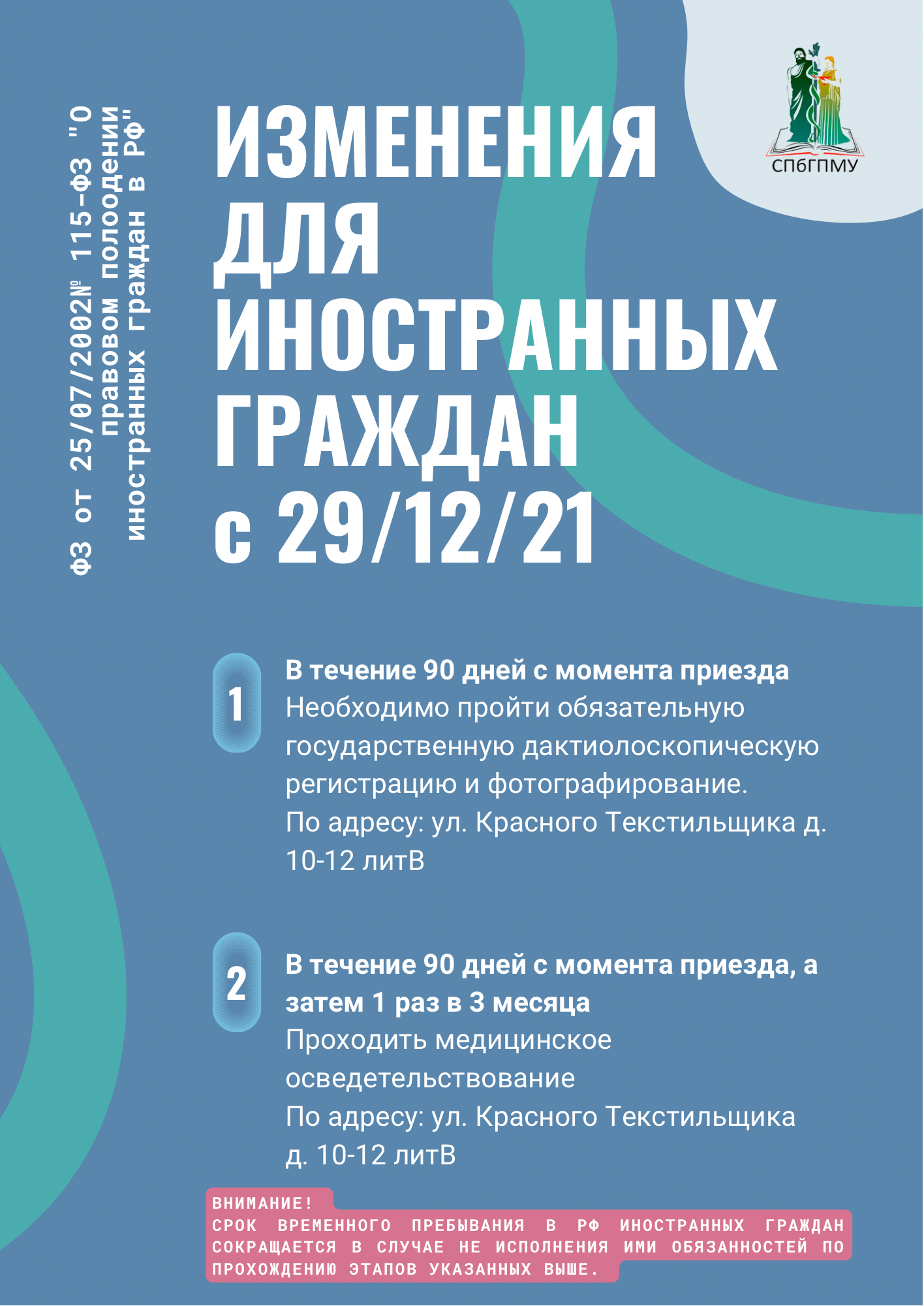 С 29.12.2021г. в соответствии с Федеральным законом от 25.07ю.2002 № 115-ФЗ «О правовом положении иностранных граждан в Российской Федерации» ФГУП «ПВС» иностранным гражданам, прибывшим в Российскую Федерацию необходимо пройти обязательную государственную дактилоскопическую регистрацию, фотографирование и медицинское освидетельствование.