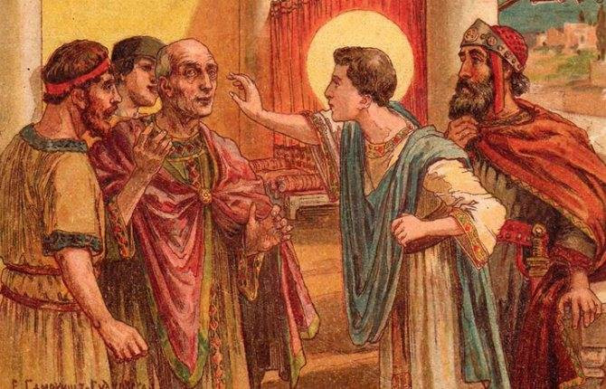 Царь вызвал Пантелеймона и приказал отречется от Христа, но юноша не согласился. Он предложил проверить, чья вера истинная – посмотреть, кто вылечит больного – он или языческие жрецы. Идолопоклонникам это не удалось, а после молитвы юноши пациент встал на ноги и отправился домой. Жрецы подговорили царя казнить святого, и император поддержал это решение.