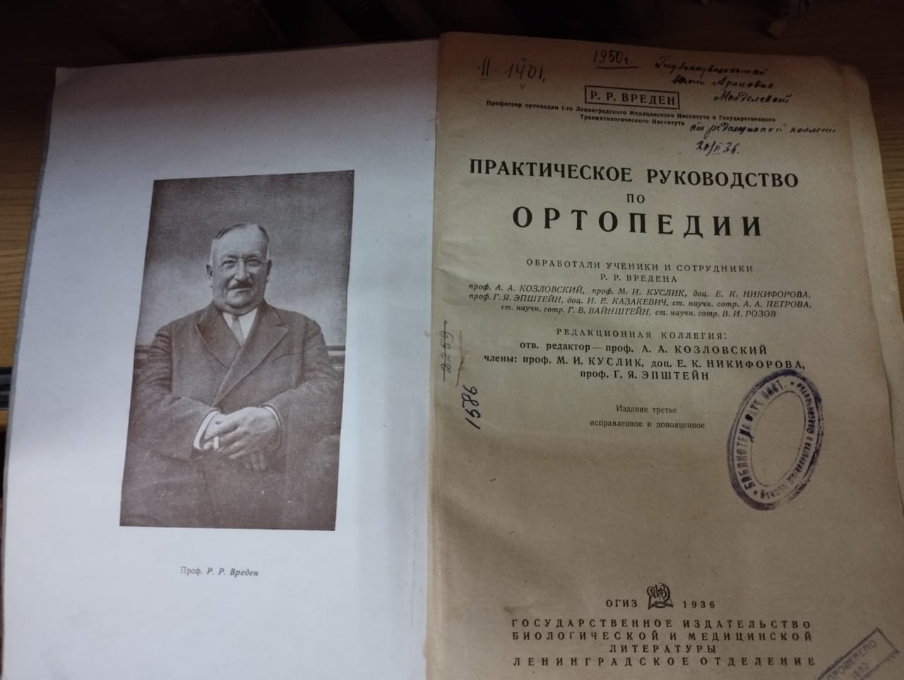 С памятной надписью «Глубокоуважаемой Юлии Ароновне Менделевой от редакционной коллегии» фонды библиотеки располагают книгой «Практическое руководство по ортопедии», которое было выпущено в 1936 году как посмертный труд выдающегося ученого, Романа Вредена (1867–1934).