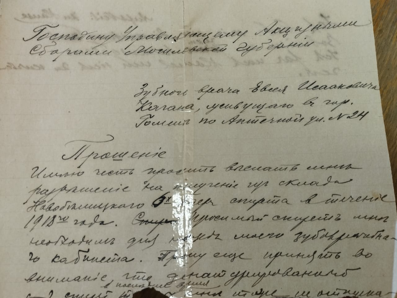 Письмо адресовано «господину управляющему акцизными сборами Могилевской губернии». Пишет зубной врач Евсей Исаакович Коган. Он просит разрешения на получение 6 литров спирта в течение 1918 года (причем, вначале написал 3 литров, но позже исправил на вдвое большую цифру). «Просимый спирт мне нужен для нужд моего зубоврачебного кабинета», - уточняет стоматолог.