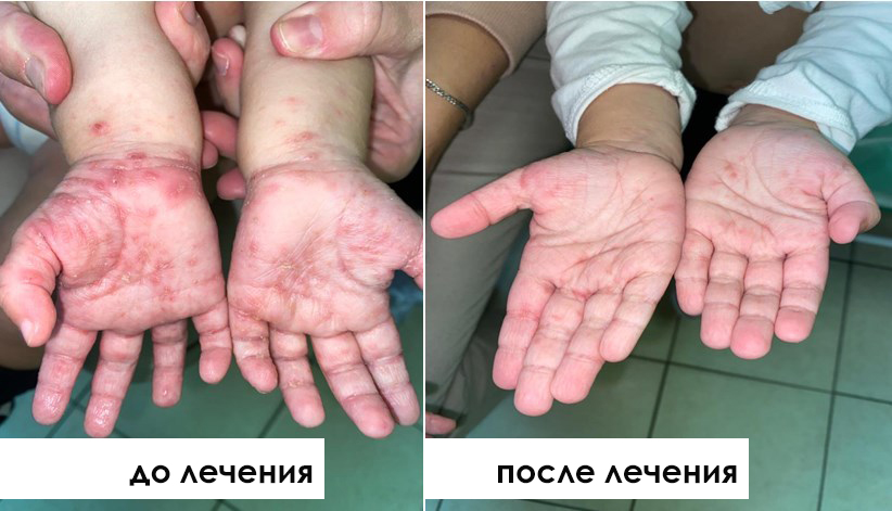 В приемном покое ребёнка и родителей осмотрел врач-дерматолог кожно-венерологического отделения СПбГПМУ. Он обнаружил значительные поражения кожи. Высыпания локализовались на ладонях и стопах пациентки, а также на кистях, в межпальцевых складках, на локтях, в области груди и живота. Сыпь наблюдалась и у родителей девочки.