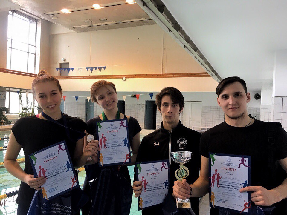 В смешанных эстафетах 4x50м (в/ст) и 4x50м (комбинированная) сборная СПбГПМУ по плаванию Пугин Михаил (1 курс), Стомова Татьяна (3 курс), Крылов Иван (6 курс), Иутинская София ( 1 курс) в серьезной борьбе взяла II место. Также индивидуальную награду бронзового достоинства завоевала студентка 3 курса Татьяна Стомова. На дистанции 100м. в/ст она замкнула тройку лидеров.
