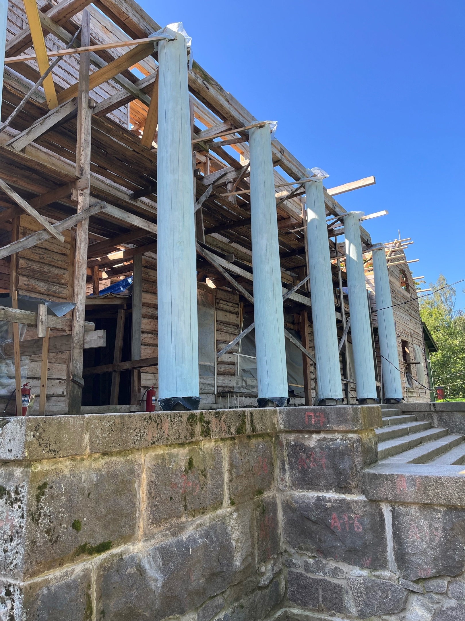 Реставрацию усадьбы начали с того, что в 2018-м по камешку переложили весь фундамент, сохранив уцелевшие «родные» фрагменты и залив под ними железобетонную подушку, в 2019-м восстановили крыльцо и колонны. Тогда же на объект заехала команда из четырех человек компании «Анфилада», лицензированная на восстановление объектов культурного наследия и согласованная с КГИОП.