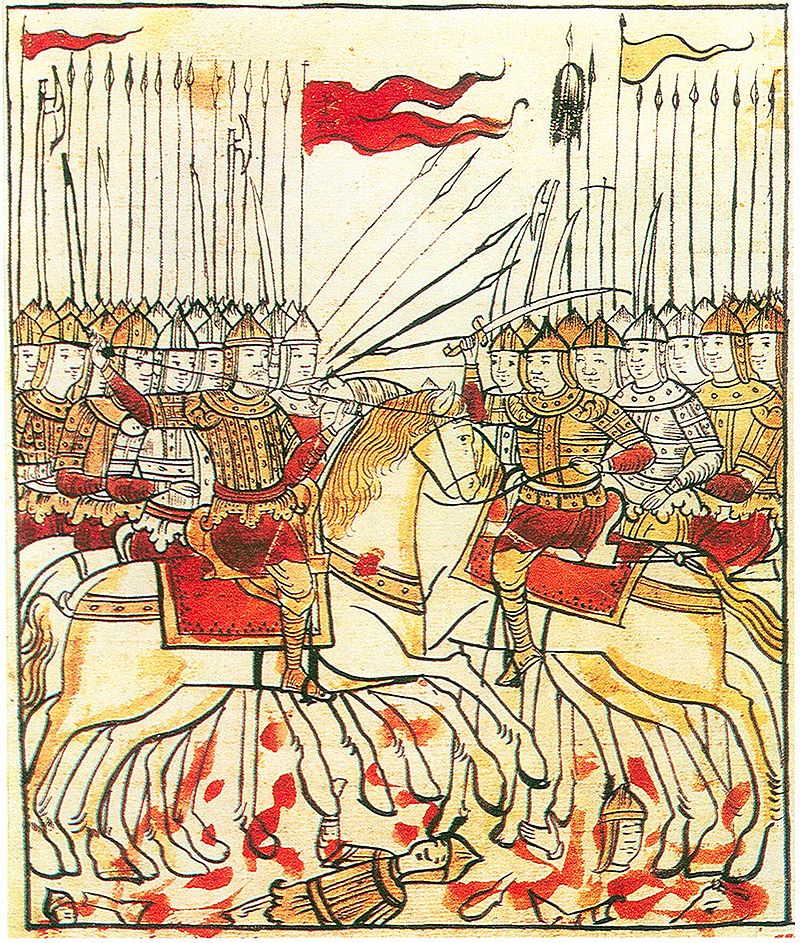 Битва на Куликовом поле в 1380 году. Видны стяги русского войска (слева). Из рукописи «Сказание о Мамаевом побоище», XVII век